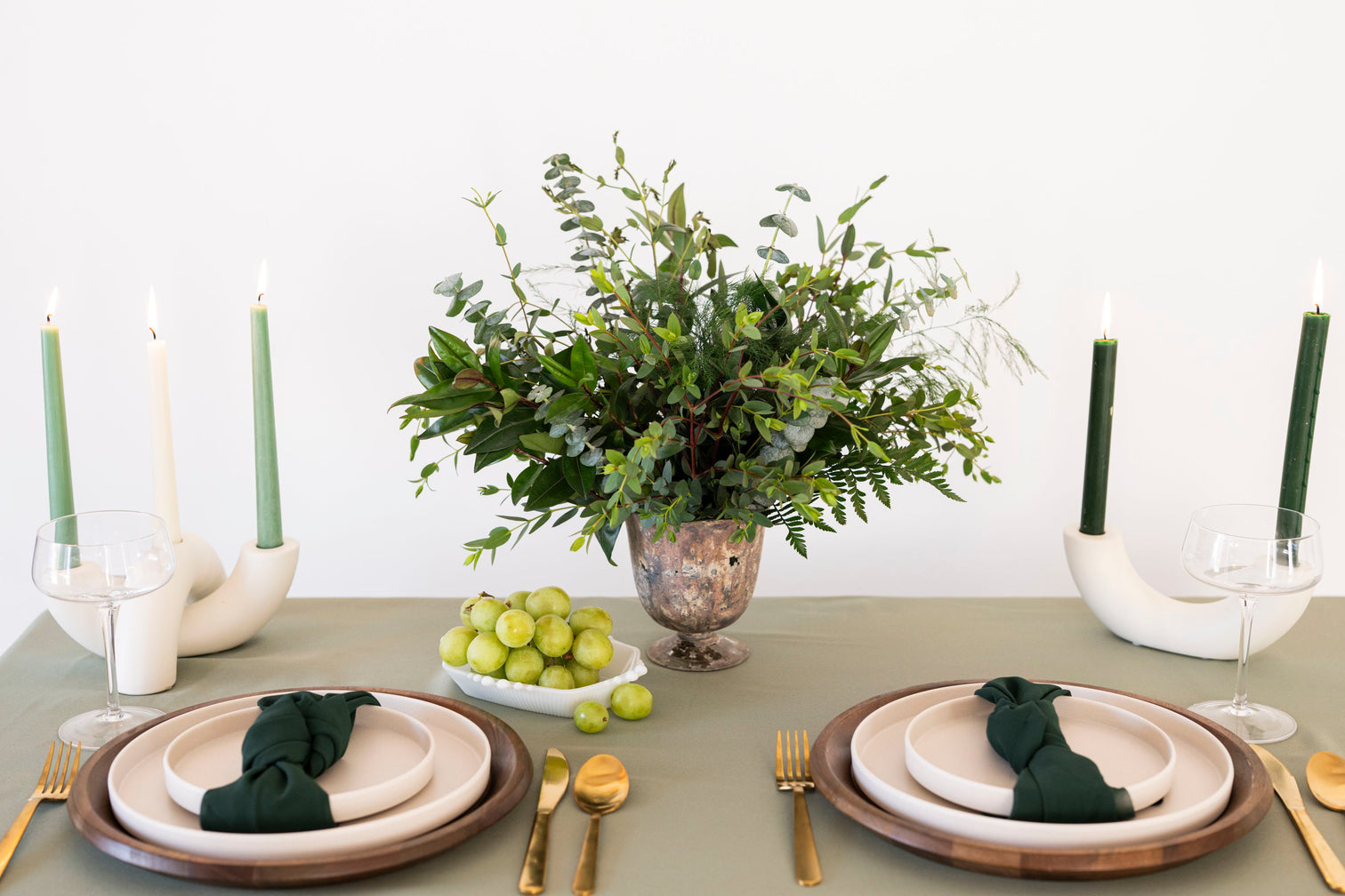 Build greenery table runners. Lay ruscus or seeded eucalyptus down a long table with votives and taper candles. No flowers required, and it photographs beautifully.
