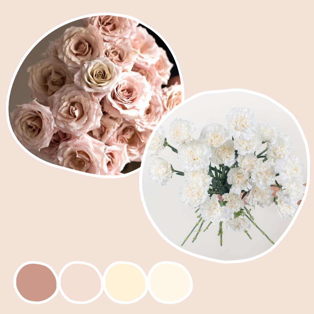 - Vibe: For a boho chic wedding, go for earthy tones like sandy, peach, or brown. For a romantic affair, opt for red or pink roses. And for a classic wedding, white roses are always a popular choice. For a wildflower feel, try using a mix of brighter colors. When in doubt, you can go for classic and timeless ivory roses, which can be paired with any other flowers or arrangements.