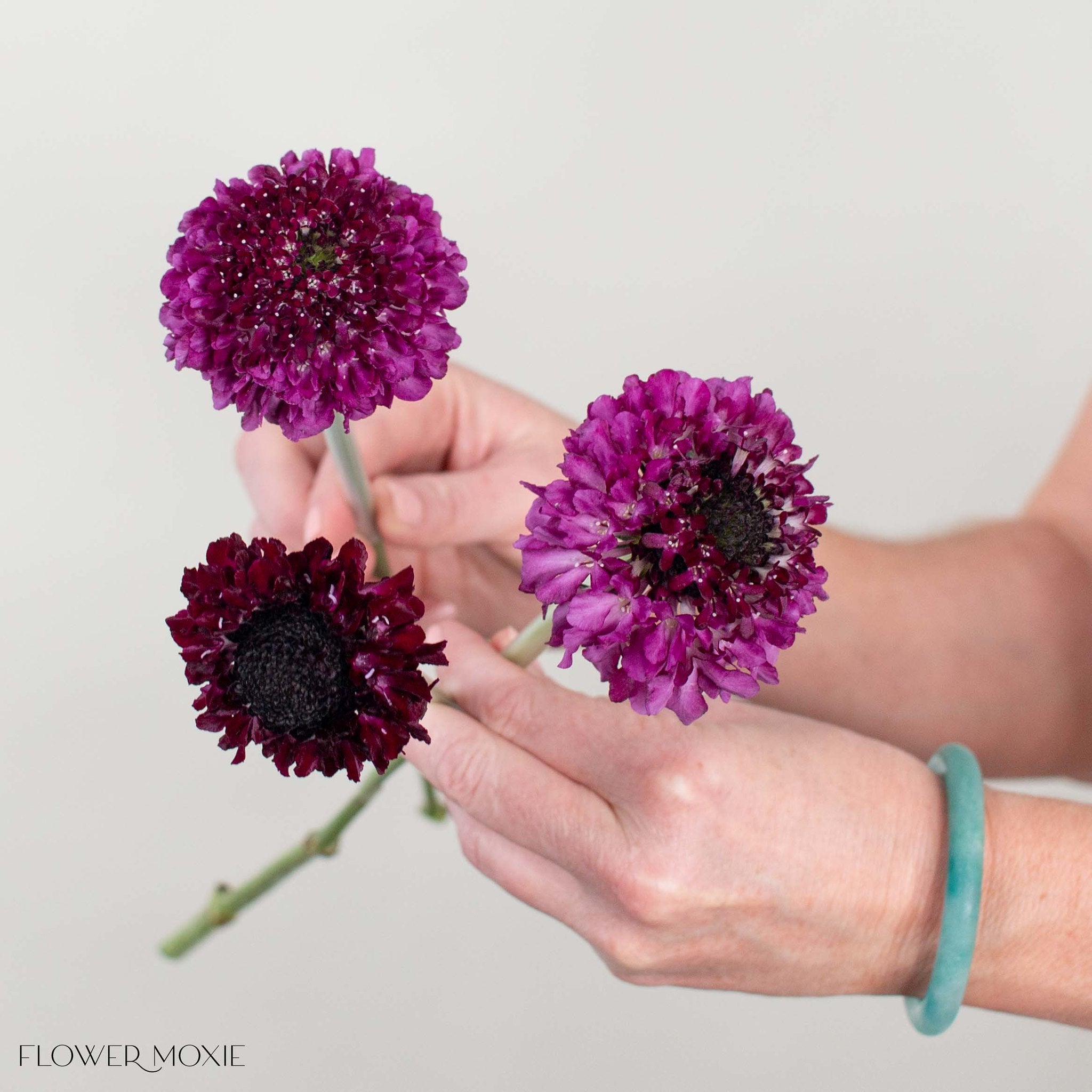 The Bad: Can be curvy with a droopy head. Has shorter vase life so keep in a cool location away from the sun. Scabiosa can have inconsistent color tones. Sometimes they can lean red-burgundy and sometimes they can lean purple burgundy. Sometimes Scabiosa will arrive not bloomed (without petals). They still lend a gorgeous texture to bouquets, bouts, and centerpieces!