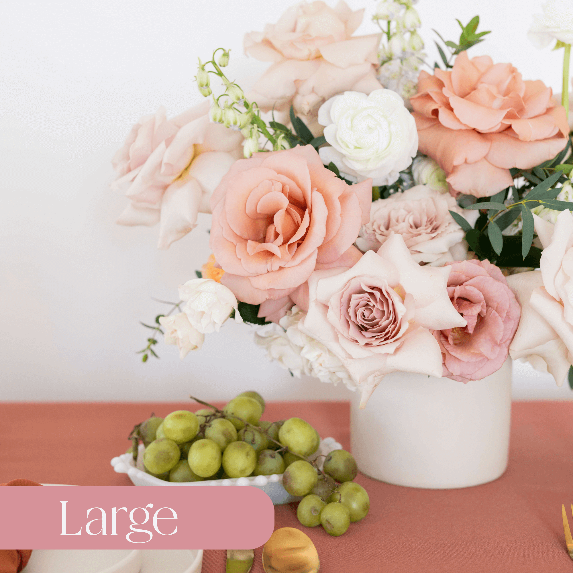 - 10 Centerpieces with 5-6'' Vase Diameter: 1 Earthy Centerpiece Base, add 2-3 Moab Roses and 2-3 White Ranunculus