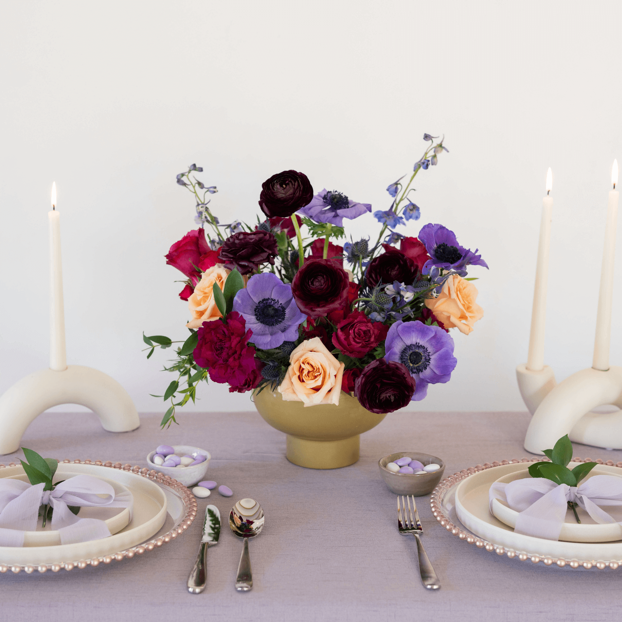 Add: 2-3 Blueberry Roses, 2-3 Purple Anemone, 2-3 Purple Ranunculus