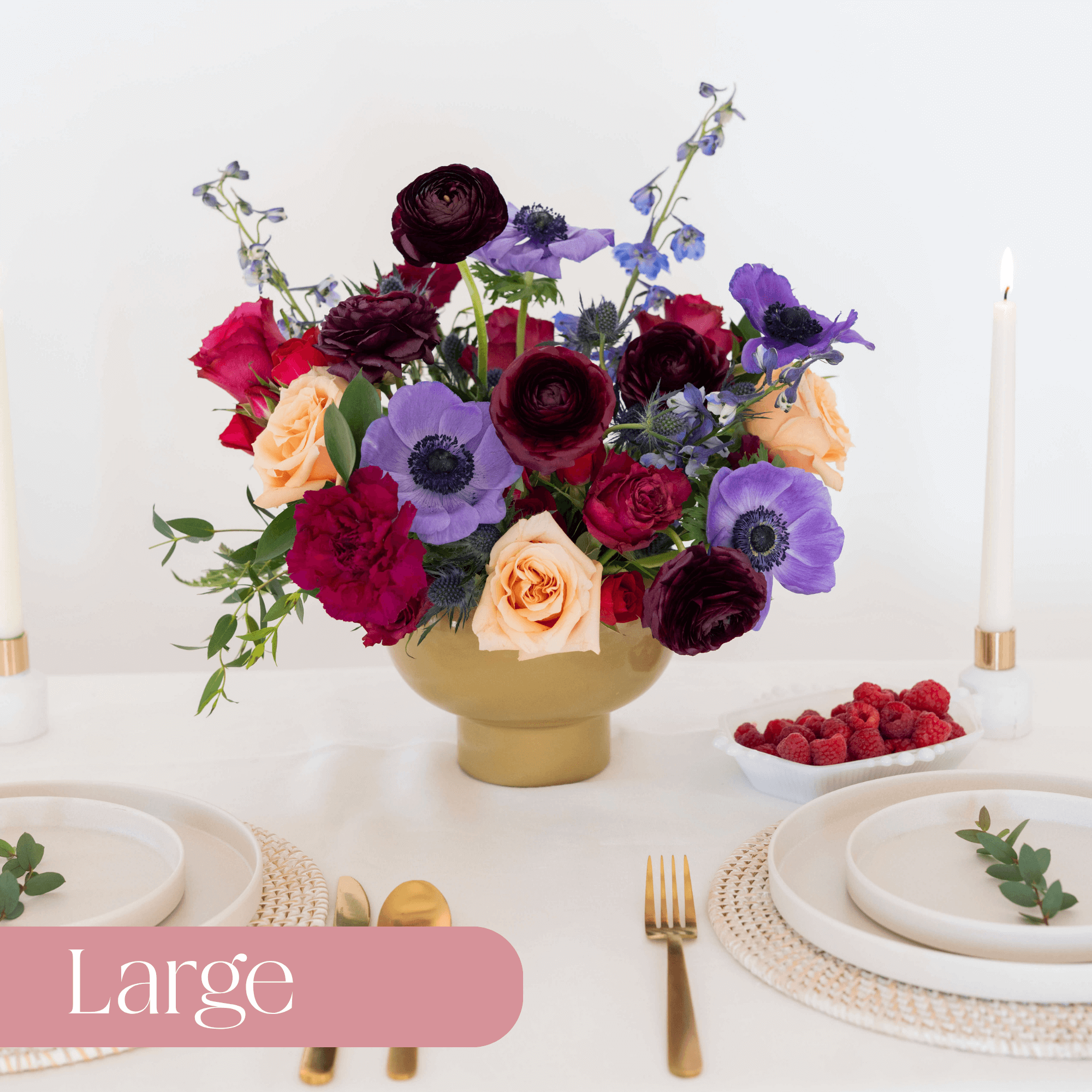 - 10 Centerpieces with 5-6'' Vase Diameter: 1 Sapphire and Ruby Centerpiece Base, add 2-3 Blueberry Roses, 2-3 Purple Anemones, and 2-3 Purple Ranunculus