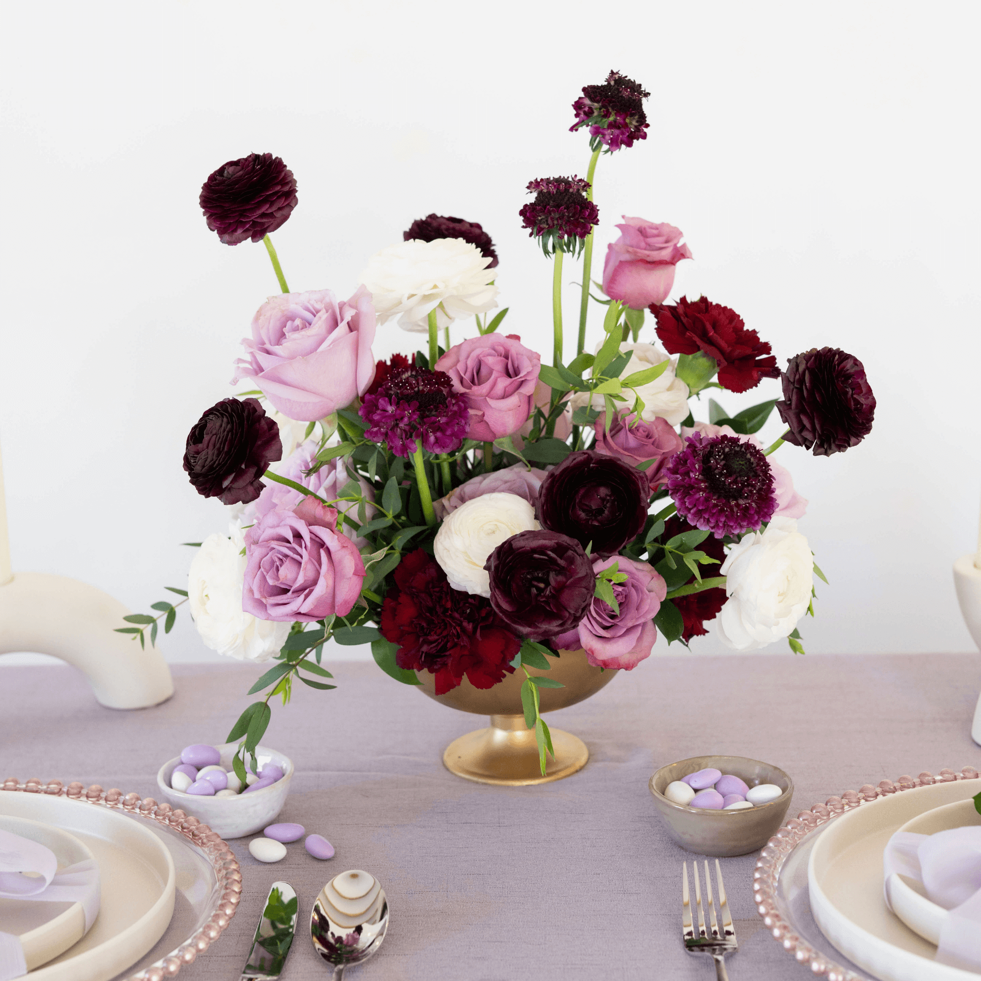 Add:2-3 Govinda Roses, 2-3 White Ranunculus, 2-3 Dark Purple Ranunculus