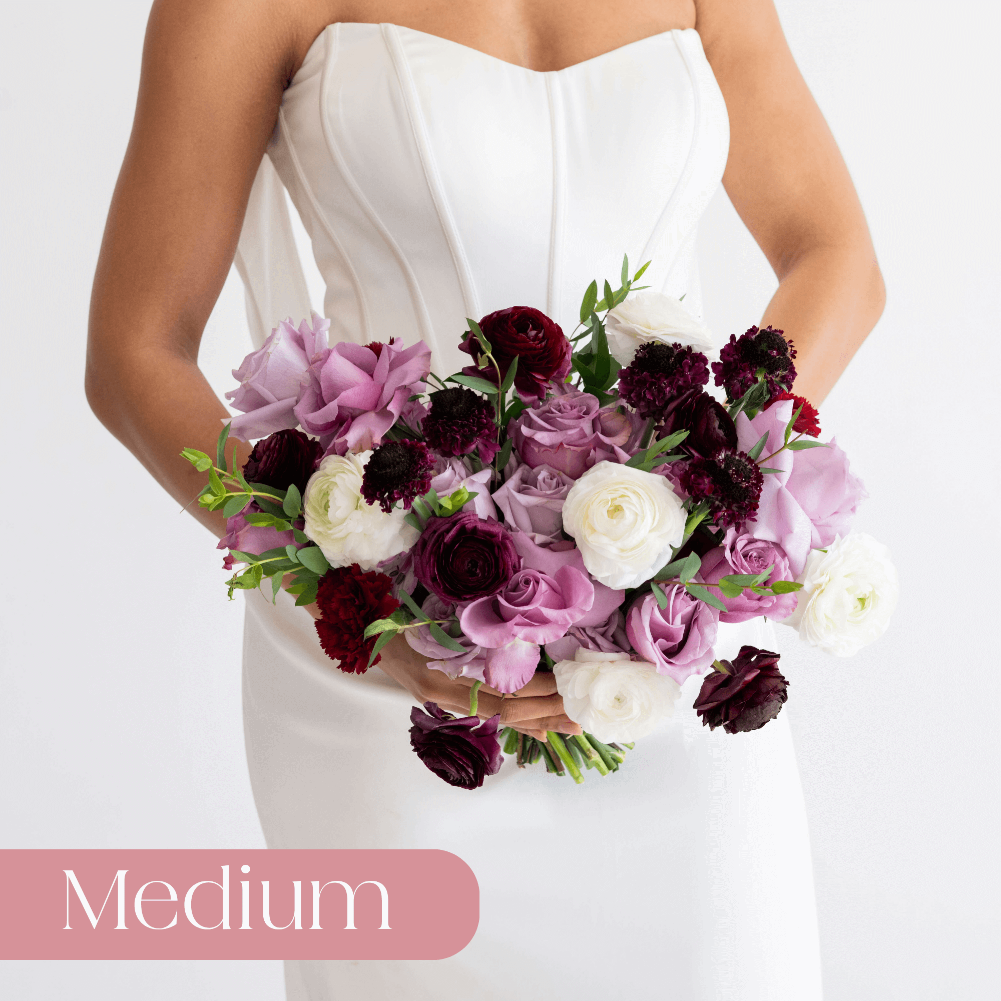 - 1 Bridal Bouquet: 1 Amethyst Bridal Base Bouquet, add 4-5 Mauve Roses, 4-5 White Ranunculus, and 4-5 Dark Purple Ranunculus