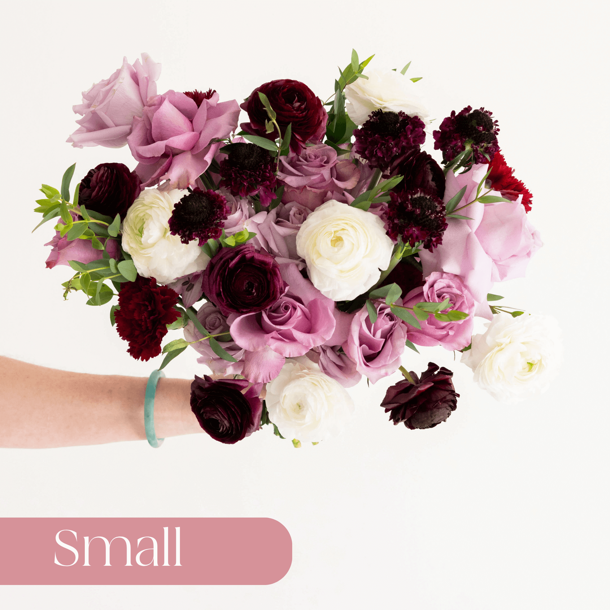 - 7 Bridesmaid Bouquets: 1 Amethyst Bridesmaid Base Bouquet, add 1-2 Mauve Roses, 1-2 White Ranunculus, and 1-2 Dark Purple Ranunculus