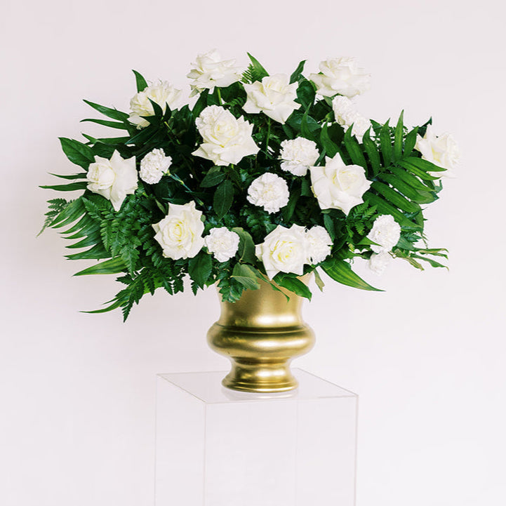 - 2 Large Ceremony Urns or Arch Cages: 12-13 White Playa Blanca Roses, 12-13 White Carnations, 1 bunch Green Hanging Amaranthus, 1/2 bunch Bells of Ireland, 1 bunch Israeli Ruscus, 1/2 bunch Salal