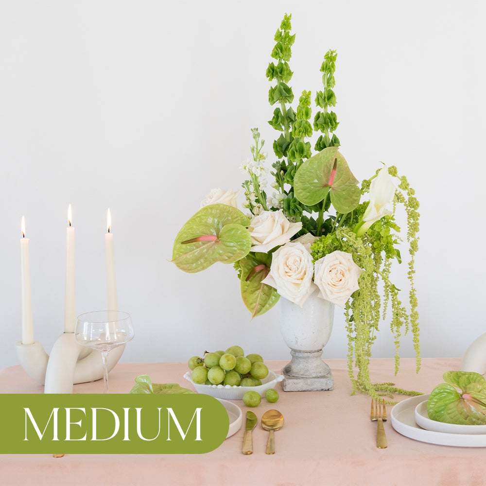 - 10 Centerpieces (5-6'' Vase Diameter): 4-5 White Roses, 3-4 Green Anthurium, 2-3 White Mini Callas, 2-3 White Stock, 2-3 Bells of Ireland, 1/4 bunch Green Amaranthus, 2-3 Mini Green Hydrangea, 2-3 Israeli Ruscus
