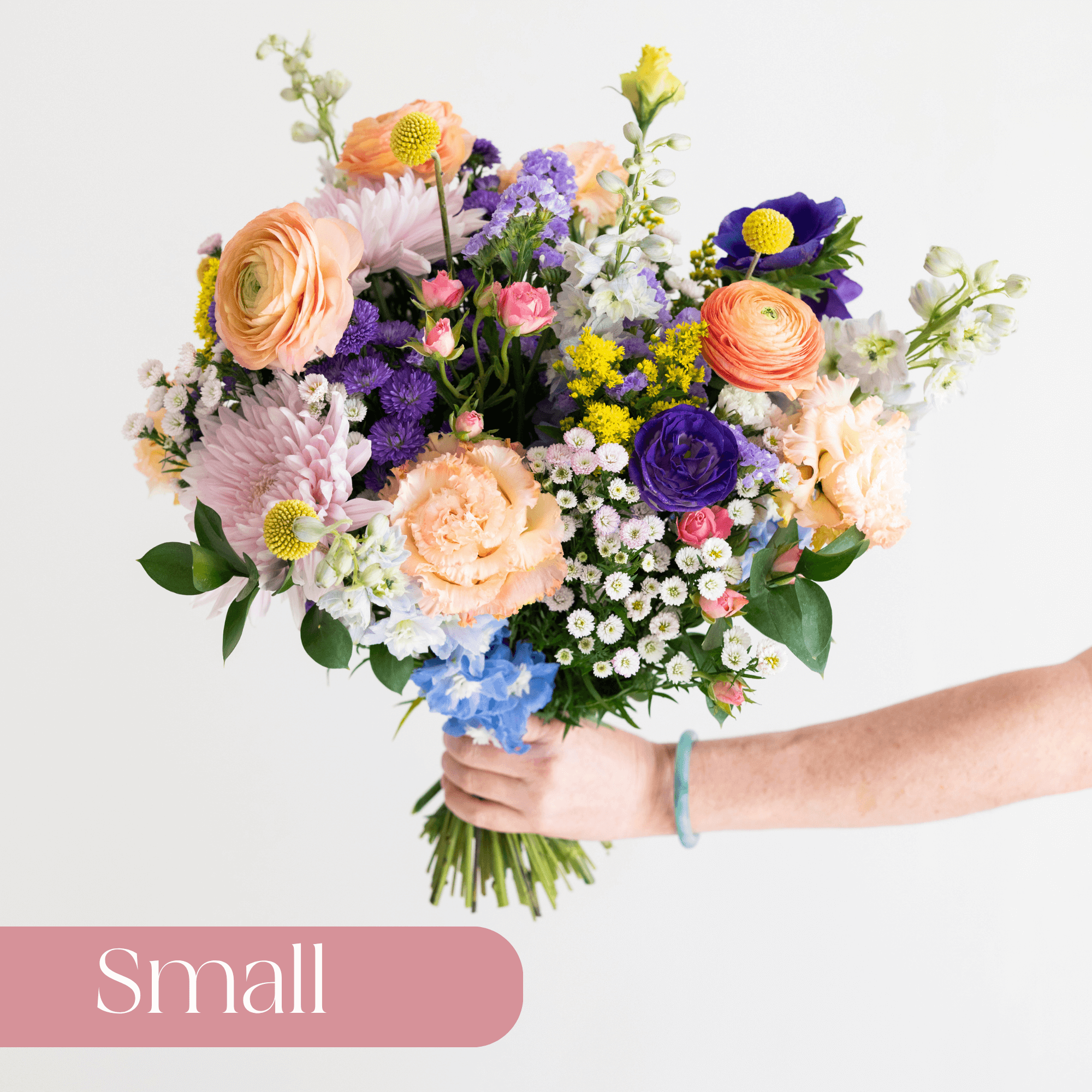 - 1 Bridal Bouquet: 1 Wildflower Bridal Base Bouquet, add 4-5 Peach Ranunculus and 4-5 Purple Anemones
